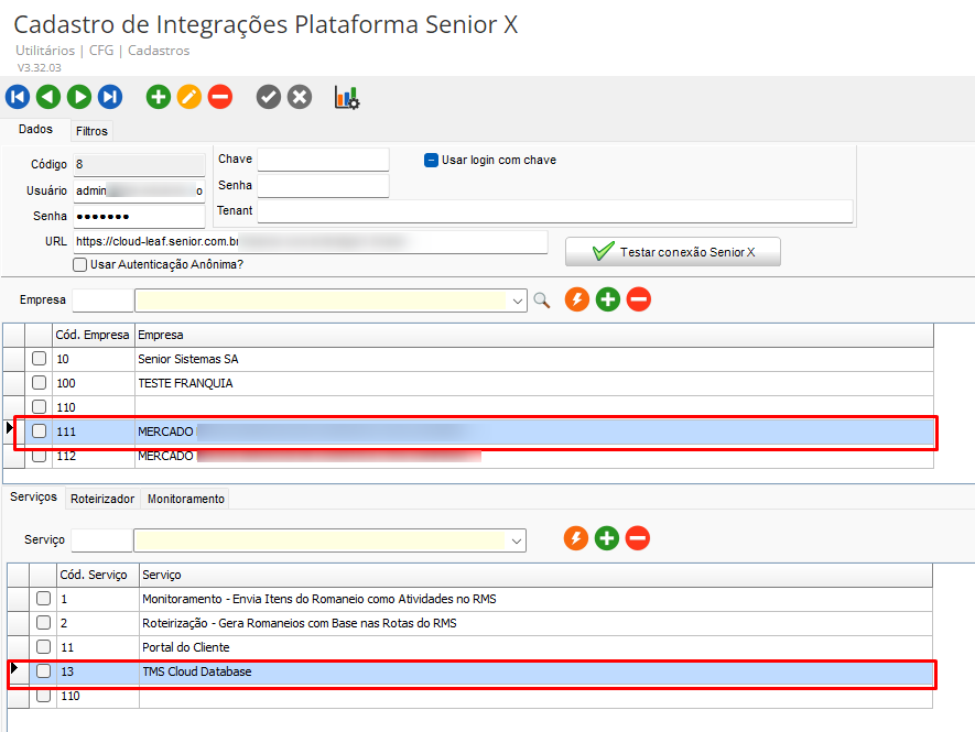 - Com a empresa da nota fiscal selecionada, adicione o serviço 13 – TMS Cloud Database.