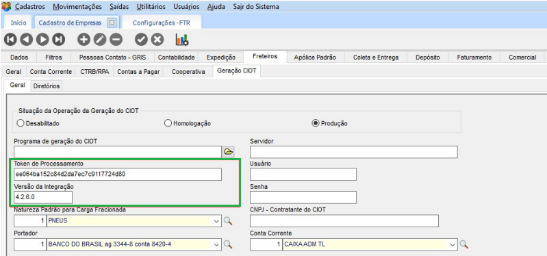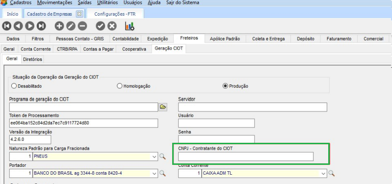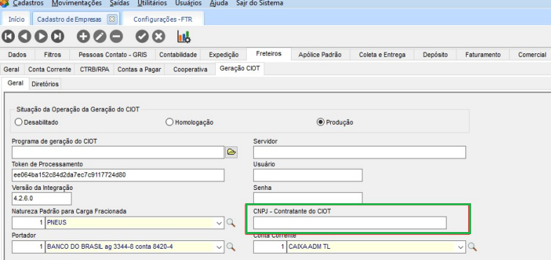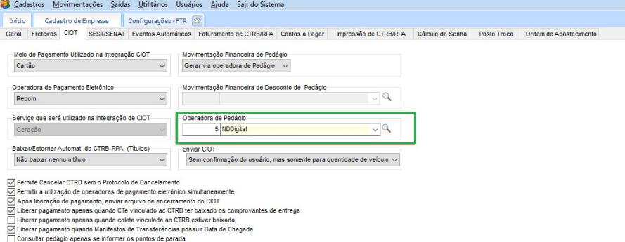Primeiro configure a operadora no módulo CFG em Utilitários > Configurações > TMS > FTR – Freteiros > CIOT: