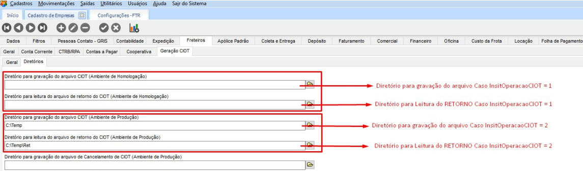 No módulo CFG em Utilitários > Configurações > TMS > FTR – Freteiros > Freteiros > Geração CIOT > Diretórios: De acordo com o configurado (homologação | Produção):