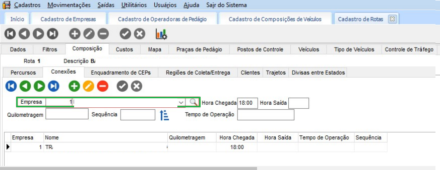 - Campo 1 codigoIBGE|cep : em FTR > Cadastros > Logistica > Rotas > Composição > Conexões. De acordo com a rota informada o sistema busca a empresa configurada. Com a empresa configurada o sistema busca o CEP da empresa no cadastro de empresa: