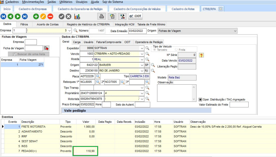 - Exemplo de cálculo do pedágio de acordo com os arquivos dos prints anteriores: