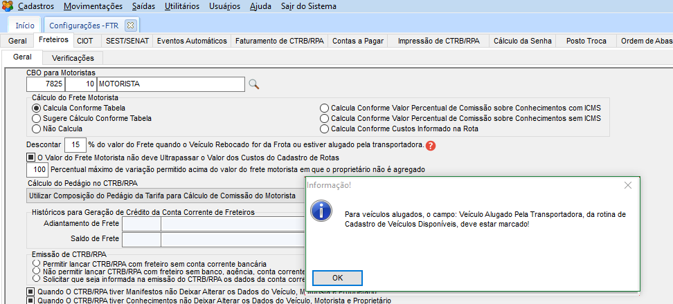 Na opção Cálculo do Frete Motorista, precisar estar marcado uma das opções abaixo: