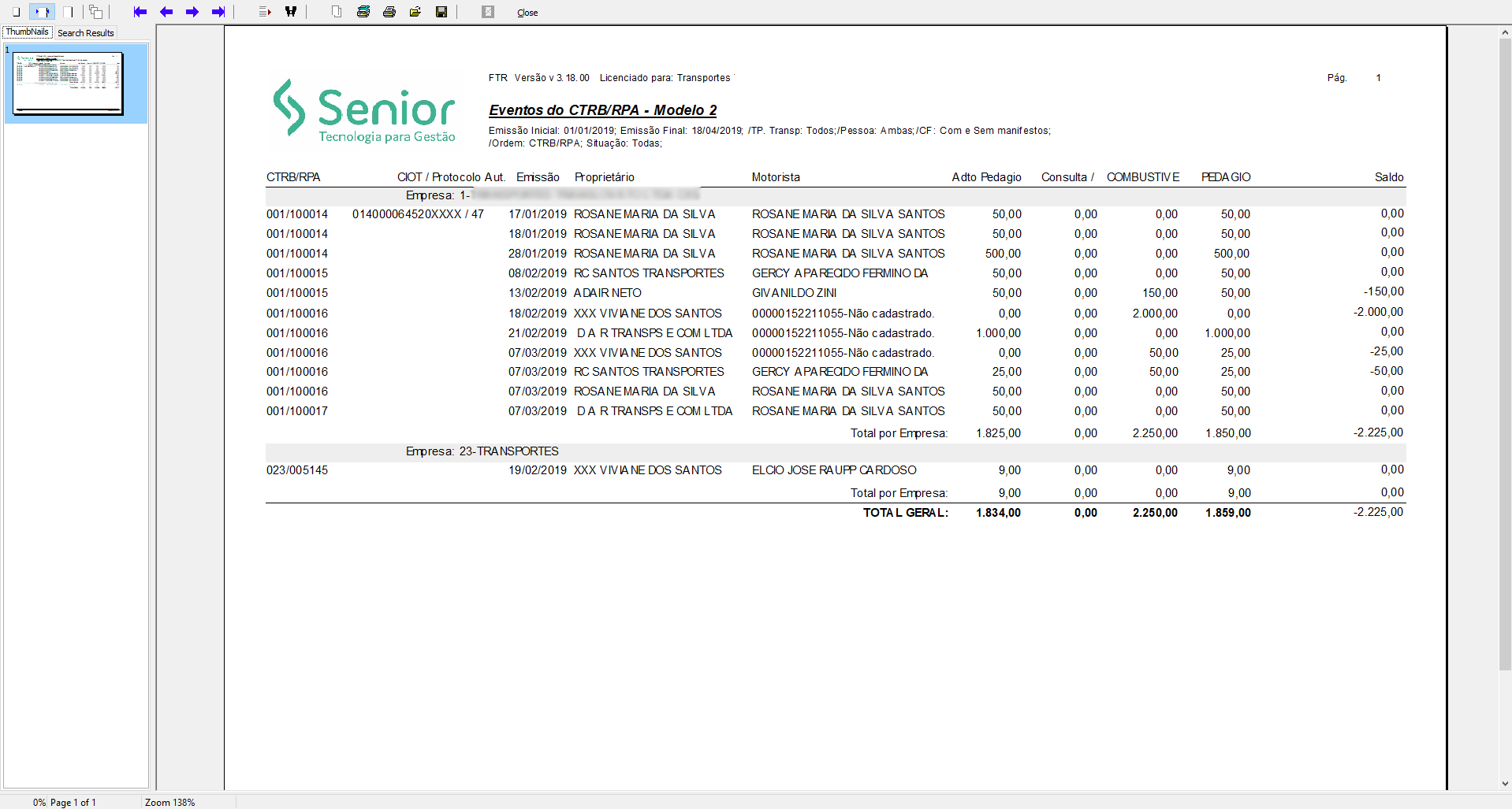 Baseados nos filtros realizados e opções selecionadas, a rotina gera uma tela com o relatório dos eventos do CTRB/RPA. Neste relatório, são apresentados o número do CTRB, o CIOT com o protocolo de autorização, data de emissão, proprietário, motorista e também os valores dos eventos selecionados na tela de filtro.