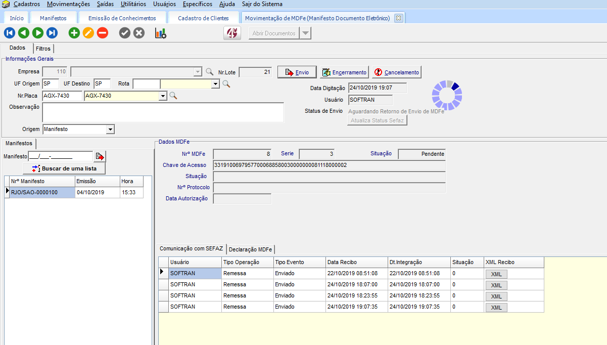 No módulo EXP em Movimentações > MDFe (Manifesto Eletrônico), cadastre um novo registro e adicione o mesmo manifesto configurado.