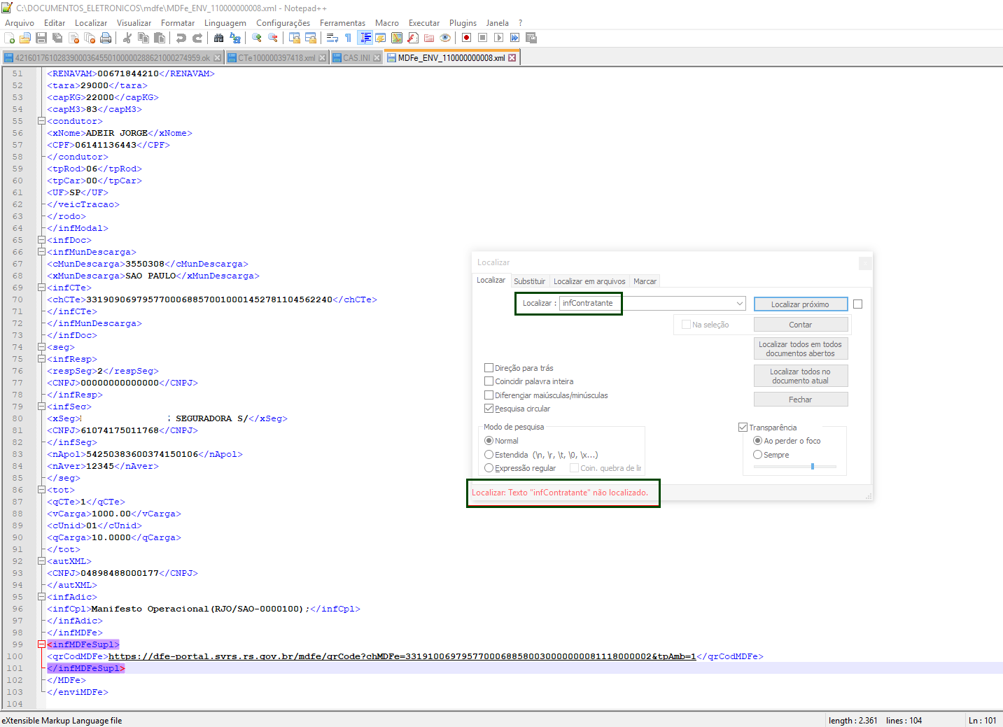 Quando o pagador do conhecimento vinculado ao manifesto for estrangeiro, e a inscrição do mesmo for 00000000000000, o sistema não deve apresentar a tag infContratante, ao emitir o XML no manifesto eletrônico.