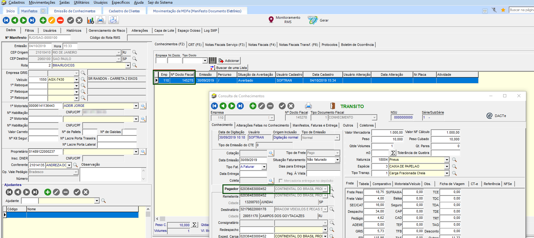 A rotina de manifesto de Documento eletrônico permite que seja possível autorizar XML de MDF-e que possua CT-e com pagadores internacionais.