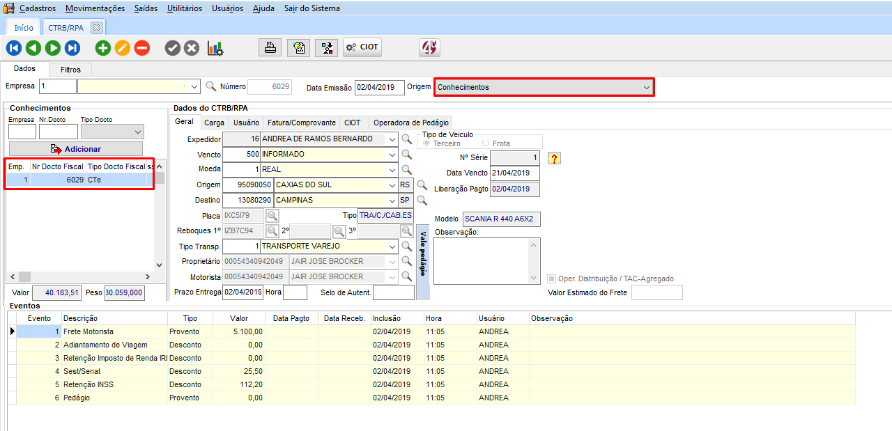 - Gerar o CTRB/RPA, com origem Conhecimentos (com este conhecimento cadastrado vinculado) e autorizar o CIOT;