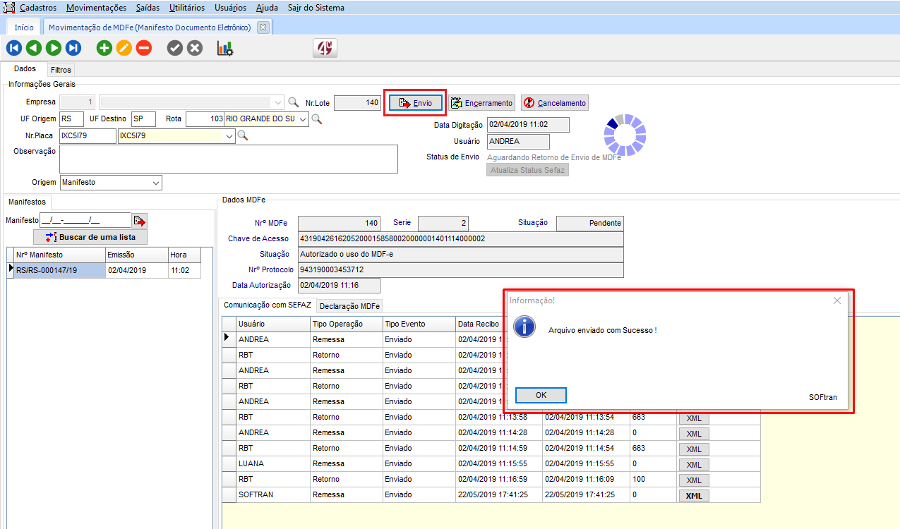 - A partir da rotina de emissão de conhecimento, gerar o MDFe (gera o manifesto e o lote do MDFe);