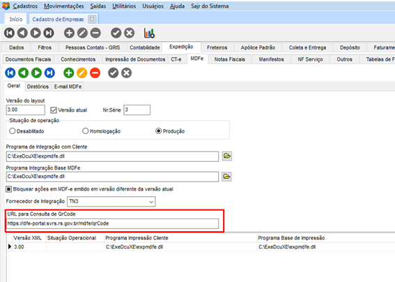 No módulo CFG, em Cadastros > Empresas, guia Expedição > MDFe > Geral, incluímos o campo URL para Consulta de QRCode. Permitindo o usuário configurar de acordo com a necessidade.