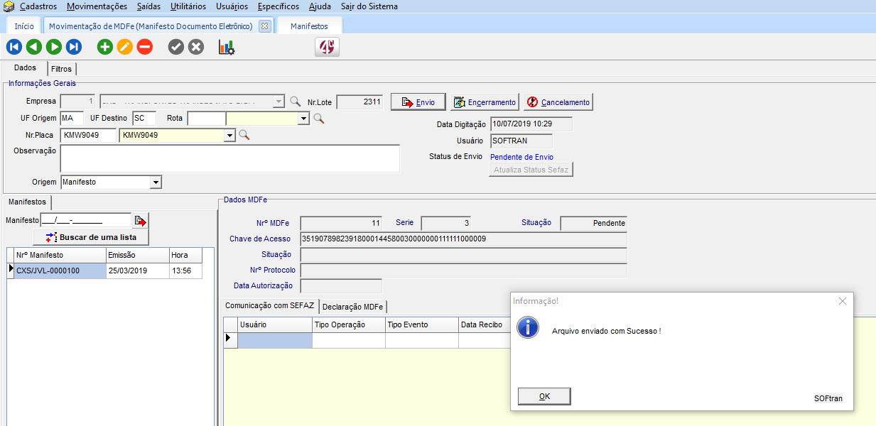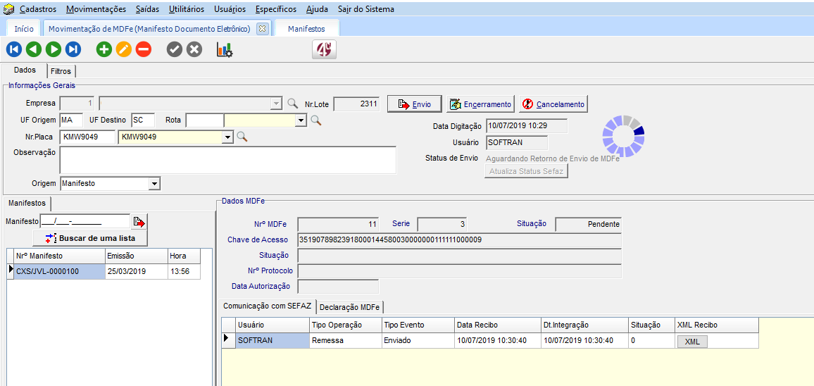 Para exportar o QRCode para MDFe para o leiaute 3.00a, acesse o módulo EXP, em Movimentações > MDFe (Manifesto Eletrônico), cadastre um novo registro, e clique em Envio para gerar o XML.