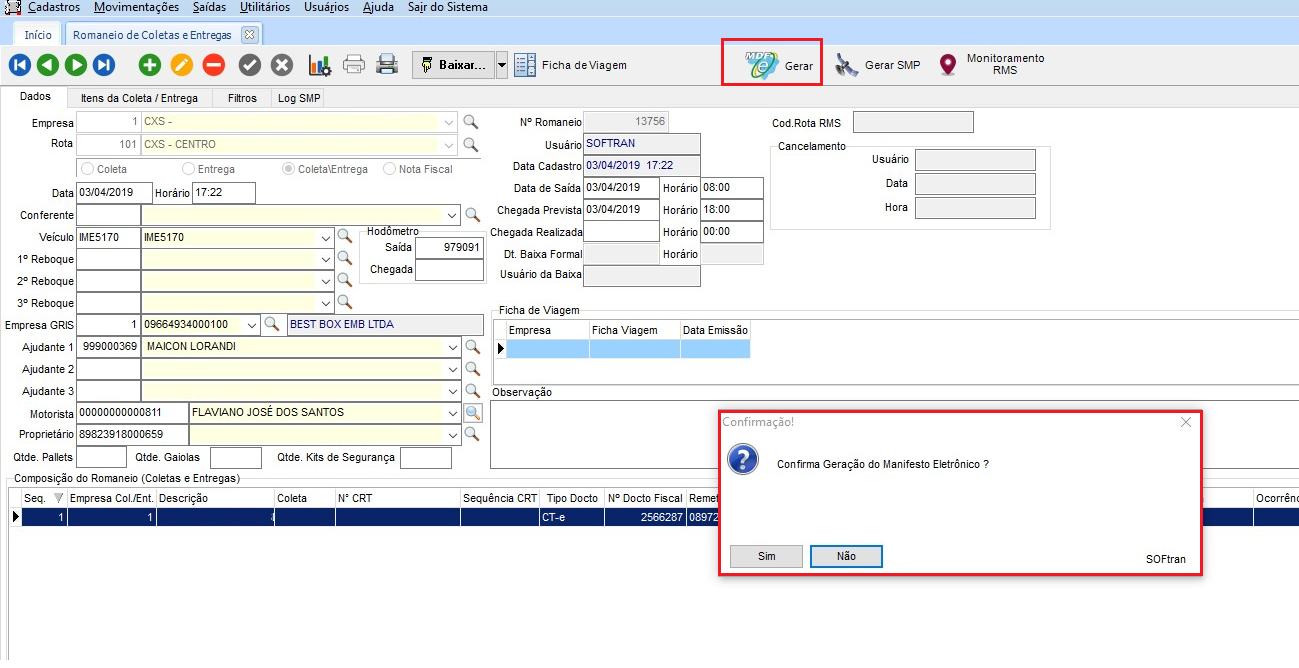 Selecionado uma rota, o sistema apresenta a tela do Manifesto Eletrônico, com os dados do Romaneio vinculados para o envio de autorização.