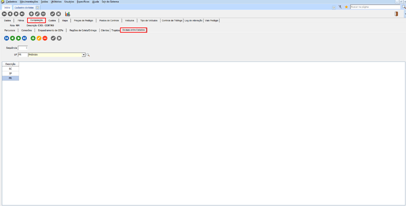 Quando o sistema apresentar a tela de “Divisão entre Estados”, é porque no menu Cadastros > Logística > Rotas > guia Composição > subguia Divisas entre Estados, foi definido na rota informada que existem divisas entre outros estados cadastradas para entrega.