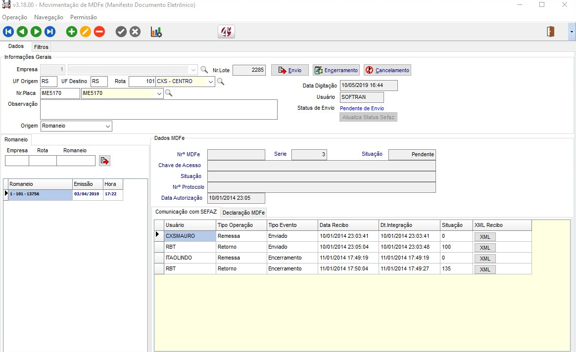 Em Movimentações > Romaneio de Coletas e Entregas, cadastrar um romaneio com a mesma rota selecionada e clicar no botão “Gerar MDFe” e confirme o processo