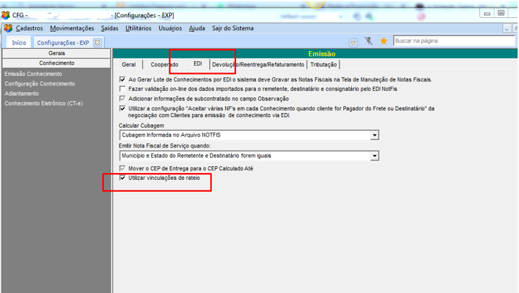 • No módulo CFG, em Utilitários > Configurações > TMS > EXP – Expedição, na guia Conhecimento > Emissão Conhecimento > EDI, marcar a configuração “Utilizar vinculações de rateio”