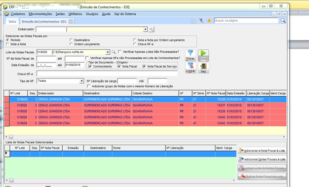Em Movimentações > EDI > Emissão > Conhecimentos, adicionado algumas notas na lista, que estejam de acordo com a vinculação e clicar em Iniciar.