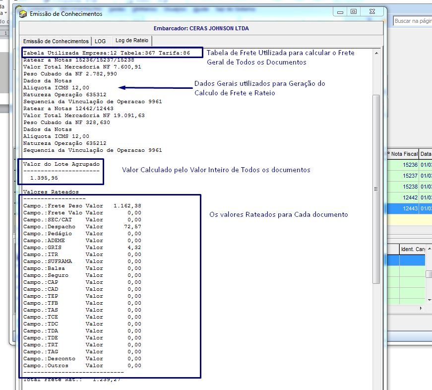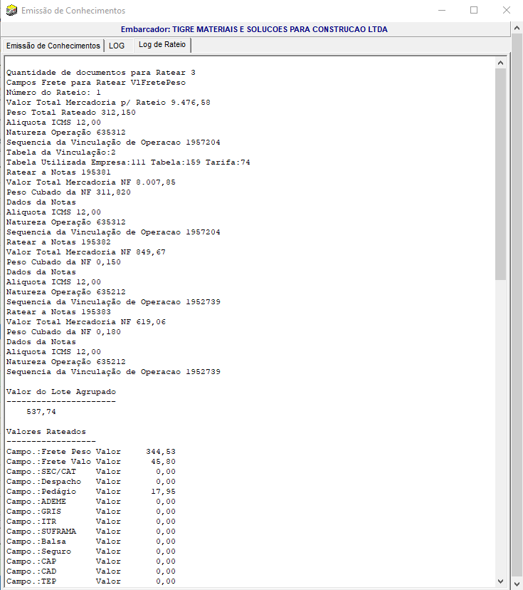Após marcada configuração e cadastrado uma vinculação de rateio, com mais de um conhecimento cadastrado. Então é possível verificar que o rateio foi realizado em cada um dos conhecimentos vinculados e no log do Rateio gerado na emissão do conhecimento: