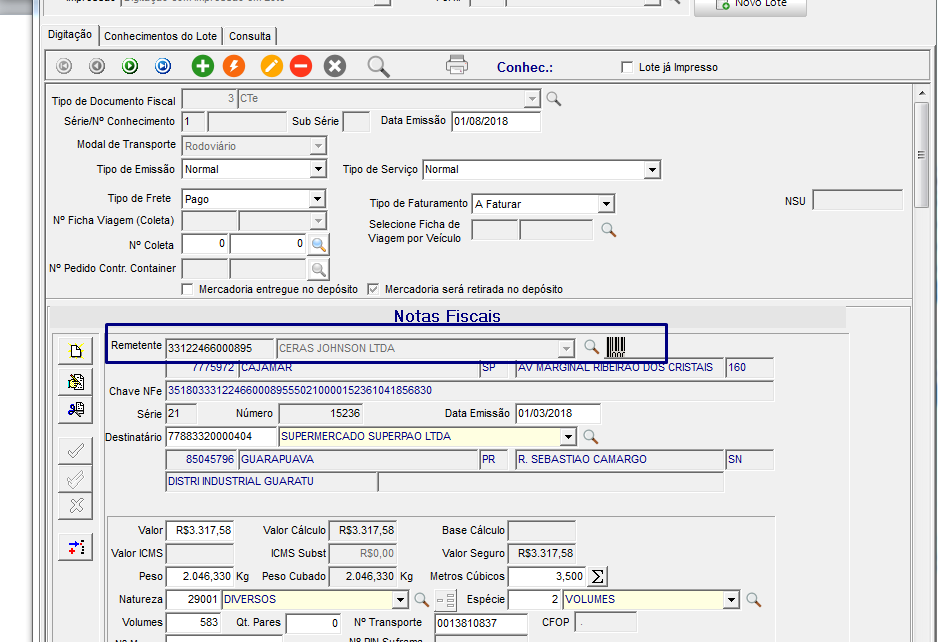 - Verifica-se que na primeira faixa criou-se uma regra para ratear somento documentos cujos os valores de Peso Cubado não ultrapassem a casa dos 1.500kg cubados. Para essa condições ,aplica-se os rateios em todos os campos. Diferentemente da segunda faixa acima de 1.500kg até 99.999,00 kg (valor extraordinário) , apenas os campos Frete Peso e Frete Valor sofrerão alterações com os valores rateados.