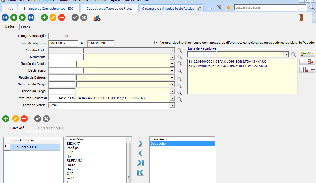 A vinculação de rateio, é o cadastro de regras que determinam quais as características necessárias, para que um conjunto de documentos de CTE, gerados pela emissão de EDI, seja rateado por um determinado fator matemático previamente configurado. Bem como, quais os campos da composição do frete sofrerão incidência do rateio.