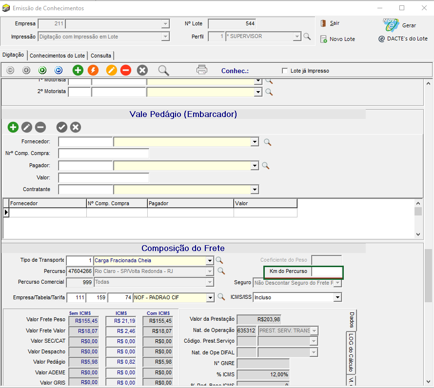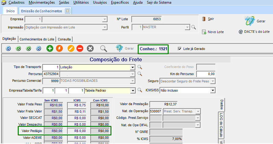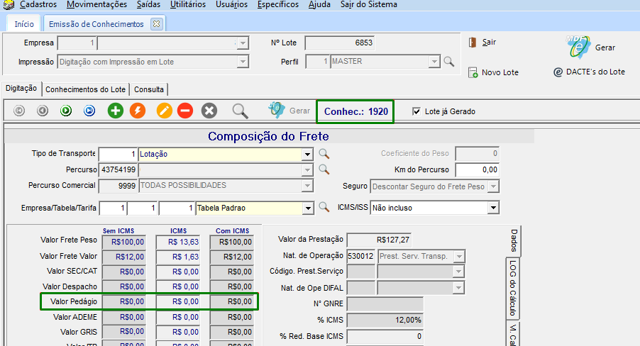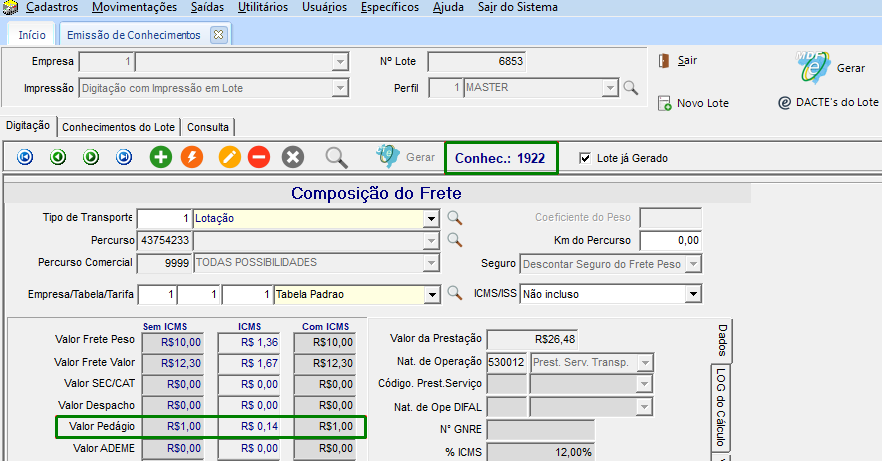 Na tela de emissão do conhecimento, cadastrado 4 documentos no lote, sendo que a taxa de pedágio que foi configurada na negociação, será apresentada somente para a partir do terceiro conhecimento: