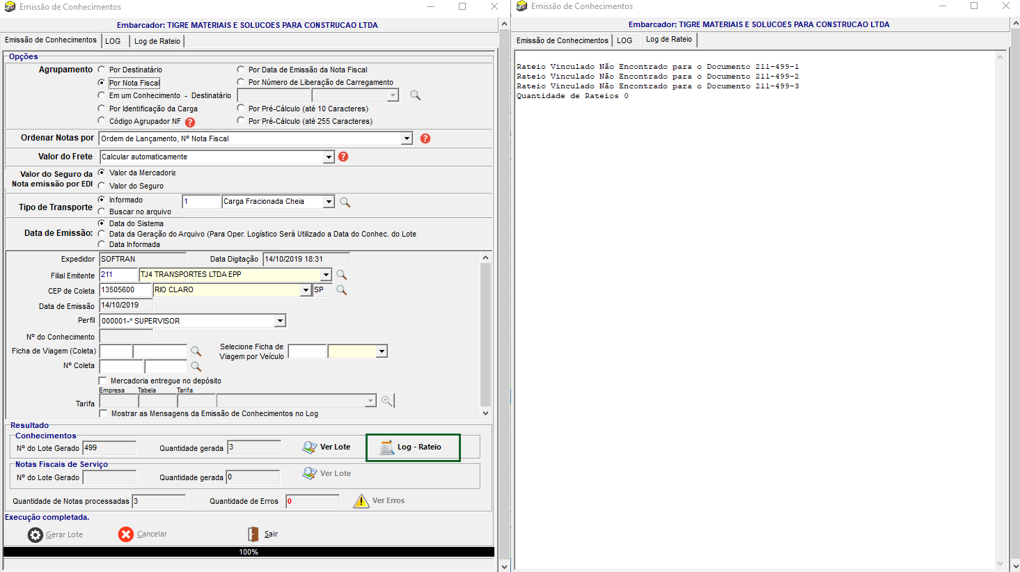 Na tela para gerar o lote, o tipo de transporte selecionado é diferente do que foi informado na vinculação. Clique em Gerar lote e após será habilitado botão Log rateio, clique e verifique que o sistema não encontra nenhuma vinculação durante a geração do lote.