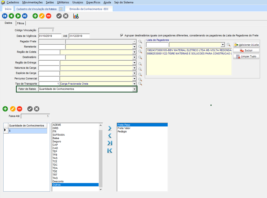 Na tela de Vinculação de Rateios, no campoFator de Rateio selecione a opção Quantidade de Conhecimentos. Cadastre uma vinculação que utilize este novo fator de rateio, alterando os valores de Frete Peso, Frete Valor e Pedágio.