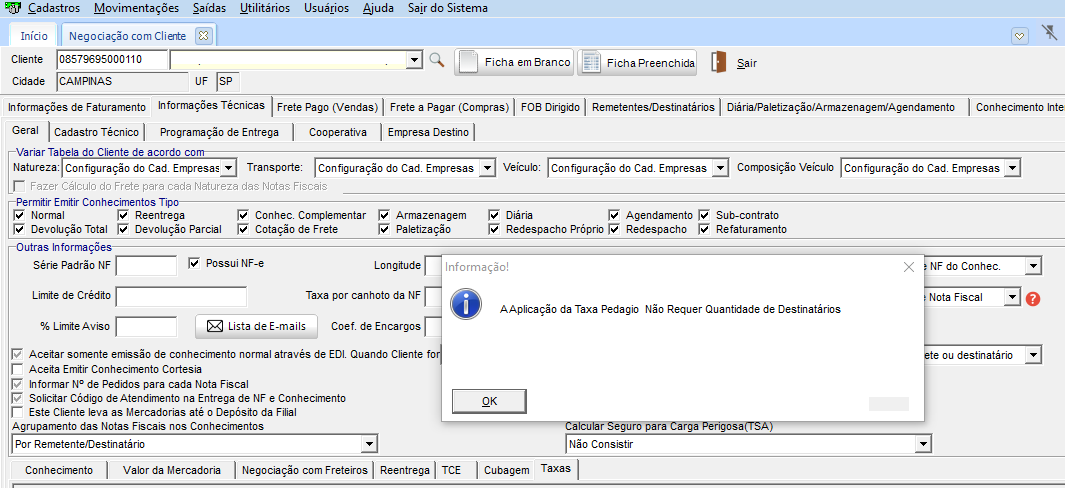 Após configurado, na tela de negociação com cliente, para o pagador do frete dos conhecimentos, selecionado na opção Ocorrências de Taxas, um registro e marcado a opção a partir de dois destinatários (como no exemplo utilizado).