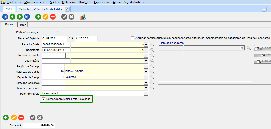 Faixa Até: Indicará para quais Faixas do Fator de Rateio será aplicado