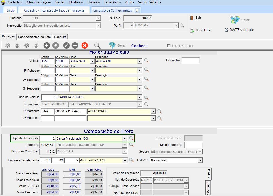 Buscar de forma automática o campo tipo de transporte na emissão do conhecimento, conforme cadastrado na vinculação, para que no momento da geração da fatura também busque os dados do centro de custo correto, para que a distribuição dos valores fique da forma correta (seja pela tabela de frete, quanto aos dados financeiros).