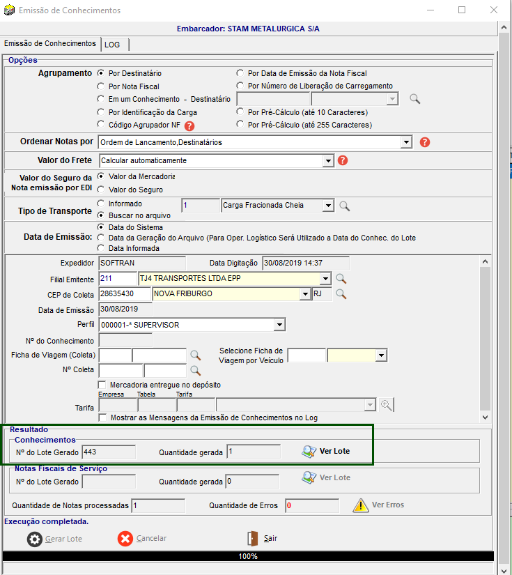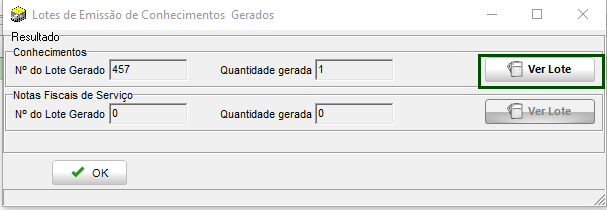 Após realizado o realizado o cadastro de uma vinculação do tipo de transporte. Ainda no módulo EXP em Movimentações > Conhecimentos > Emissão de Conhec. Via Nota Fiscal, selecionado uma nota para gerar o lote.