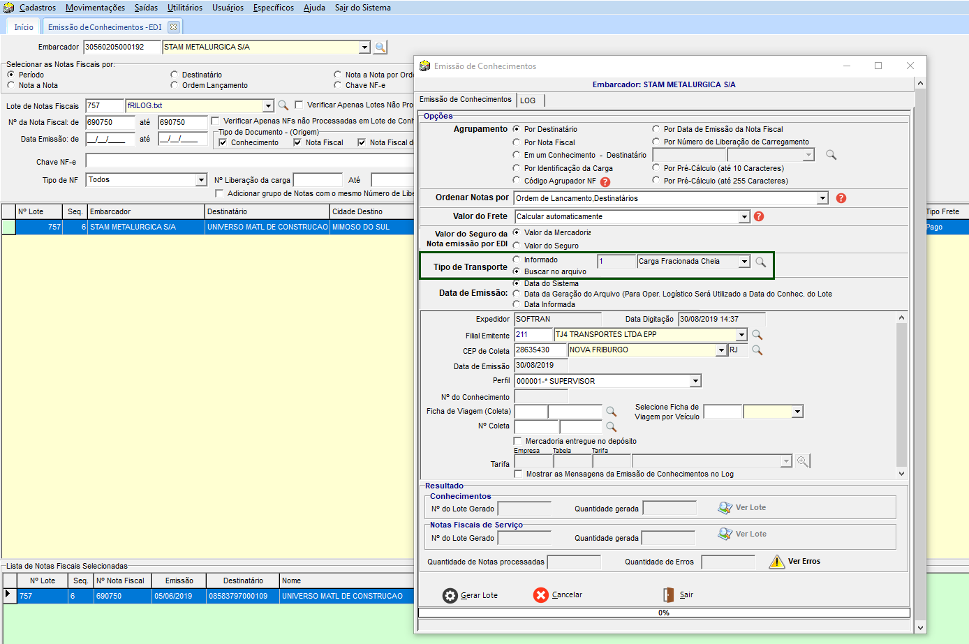 Após realizado o realizado o cadastro de uma vinculação do tipo de transporte. Ainda no módulo EXP em Movimentações > EDI > Emissão > Conhecimento, selecionado um lote de nota fiscal e uma nota que será gerado o lote. Clicar em Iniciar.