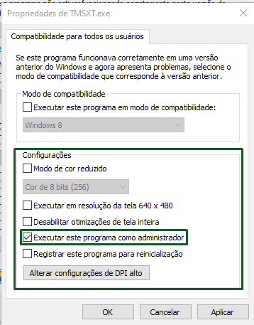 Para executar o TMS XT, é necessário definir a aplicação para que seja executada sempre como administrador, onde o usuário logado também deve ser o administrador da maquina.