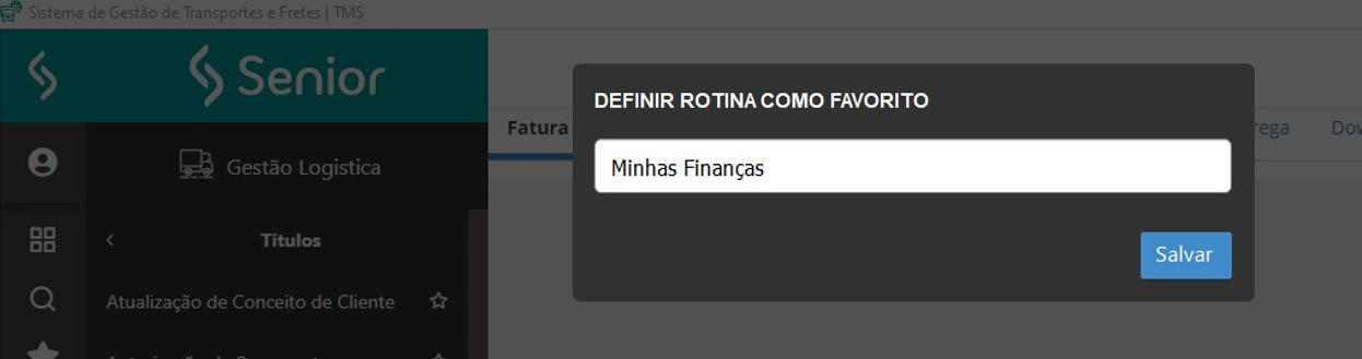 É possível editar o nome da tela salva a partir da versão 3.21.21 ou superior o TMSXT e tmsxt-app.zip. Onde, ao clicar em uma rotina e marcar como favorito é apresentado a tela para definir o nome que deseja atribuir a essa rotina. Assim, ao consultar o menu Favoritos, apresenta a descrição que você informou: