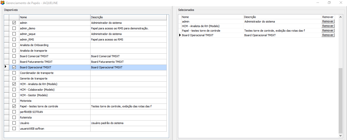 Ao acionar o botão, apresenta a tela de Gerenciamento de Papéis, com as colunas Disponíveis e Selecionados.