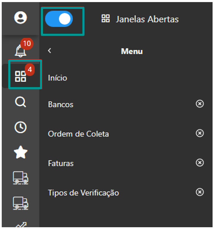 Através da opção de Janelas Abertas (1), no menu da barra lateral é possível controlar todos os menus das rotinas, bem como verificar a quantidade de Janelas Abertas (2) no momento. Onde, é possível fechar a janela diretamente no menu sem precisar chamá-la novamente, clicando diretamente no botão x (3).