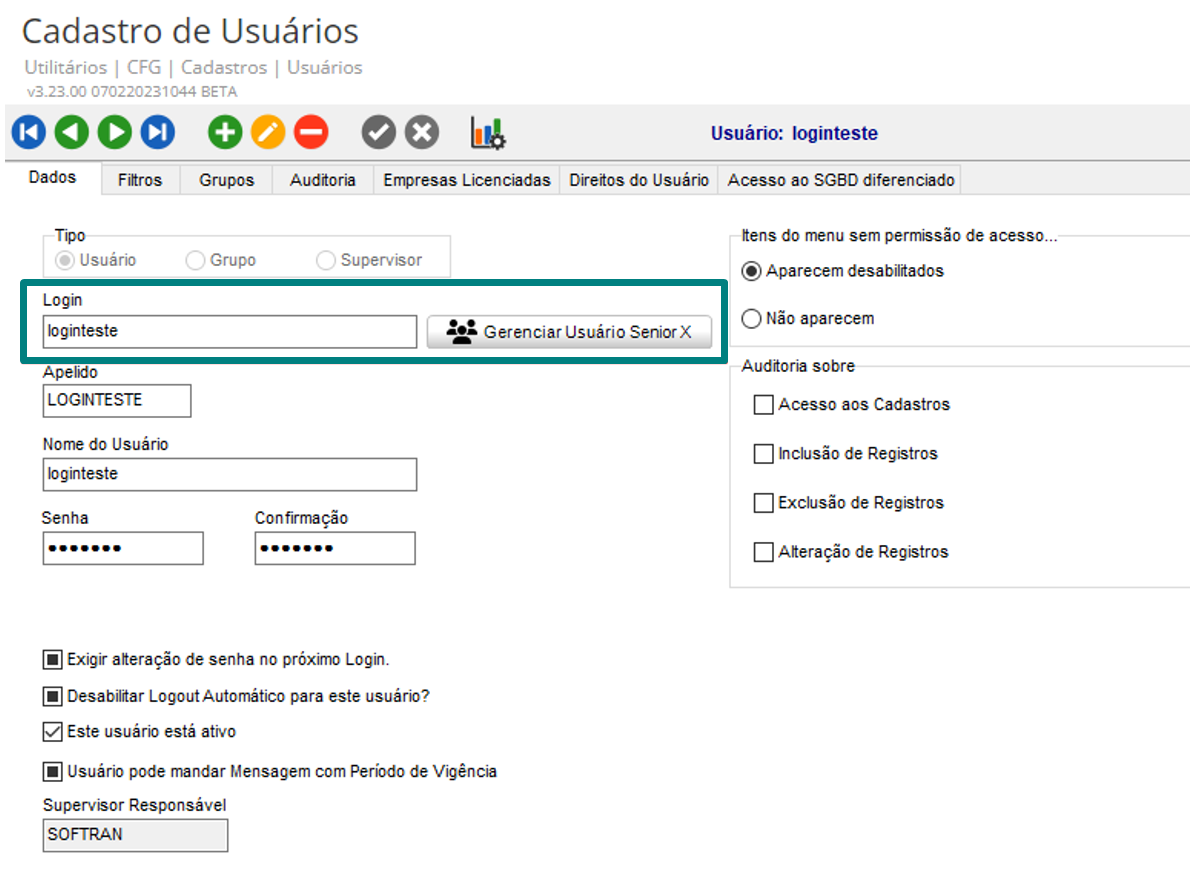 Lembramos que os usuários do tipo supervisor tem acesso total a todas as rotinas do sistema no TMSXT, sem necessidade de ativar as permissões de acesso nos menus.