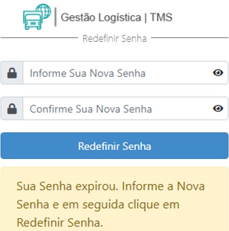 No TMSXT, ao tentar realizar o login, caso a senha estiver expirada, o sistema apresenta tela para informar a nova senha. Informe então a nova senha e clique em Redefinir Senha. Assim é retornado a tela de login para acesso ao sistema novamente.