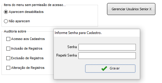 Ao clicar no botão Gerenciar Usuários Senior X, para os usuários já existentes na base de dados, o sistema apresenta a tela para incluir uma senha de cadastro ao Senior X. Esta senha segue o padrão da plataforma, caso esteja incompleta, o sistema emite mensagem para o usuário.