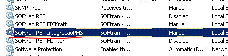 Para acessar utilize as teclas “Windows + r“ e digite services.msc e clique na tecla "Enter", procure por SOFtran onde ao encontrar o RBT correto, clique em “Iniciar”.