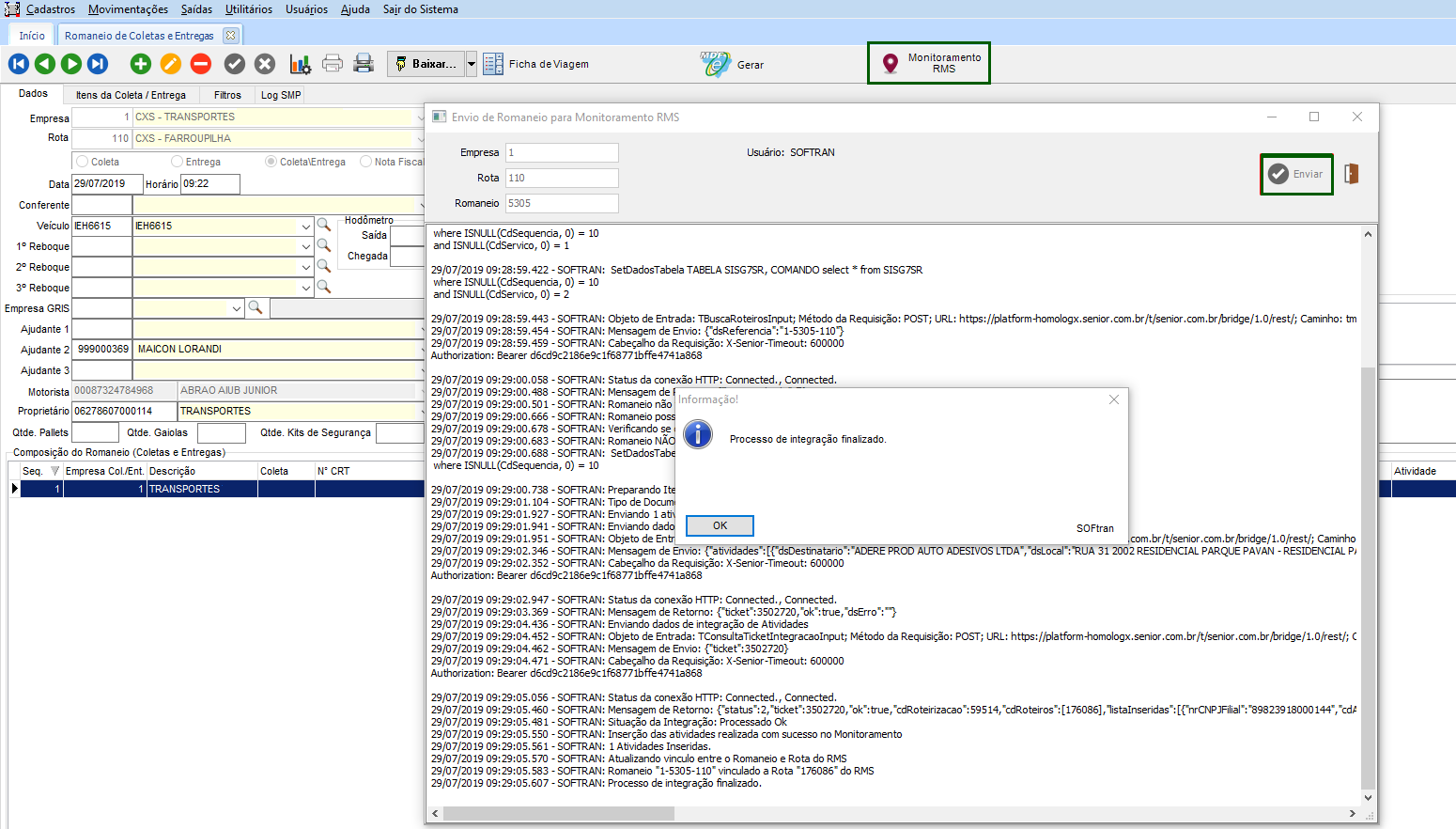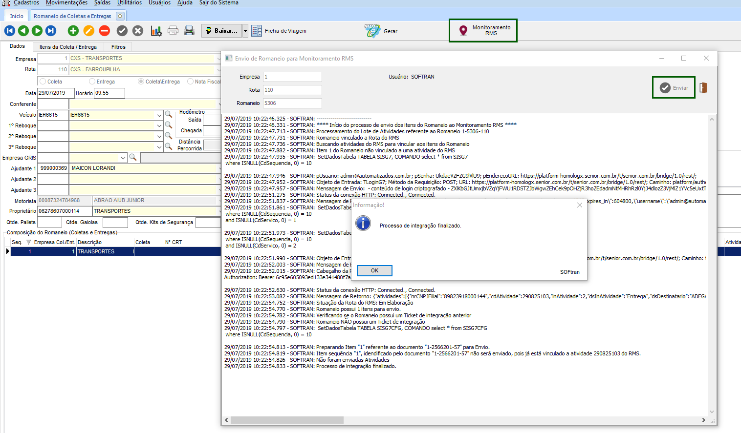 Após marcado configuração, acesse o módulo CCE, em Movimentações > Romaneio de Coletas e Entregas, cadastre um novo registro e clique no botão Monitoramento RMS e na próxima tela clique em Enviar, assim os dados serão enviados para realizar a integração.