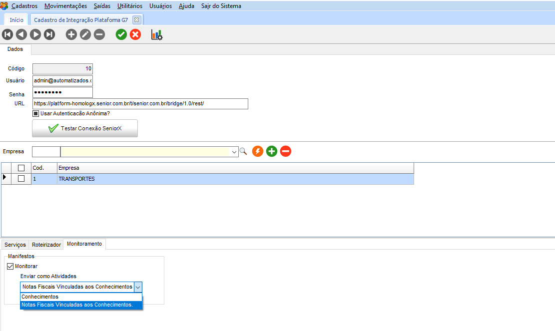 Na guia Monitoramento, selecionar uma das opções de envio de atividades: Conhecimento ou Notas Fiscais Vinculadas ao Conhecimento, para monitorar a integração com o RMS.