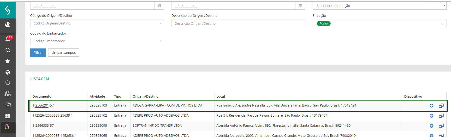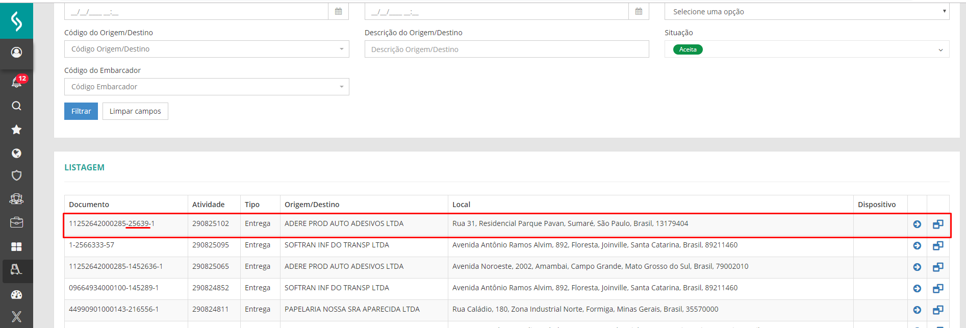 No RMS, em Gestão Logística > Otimização Logística > Roteirização e Monitoramento > Atividades > Entregas, coletas e serviços. Consultar o registro que foi integrado, apresente corretamente os dados com o número da nota fiscal vinculada ao conhecimento.