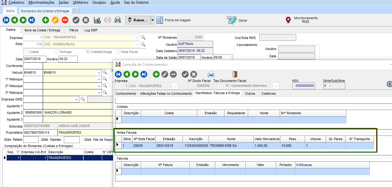 Enviar NF-e/Conhecimento para RMS no Romaneio