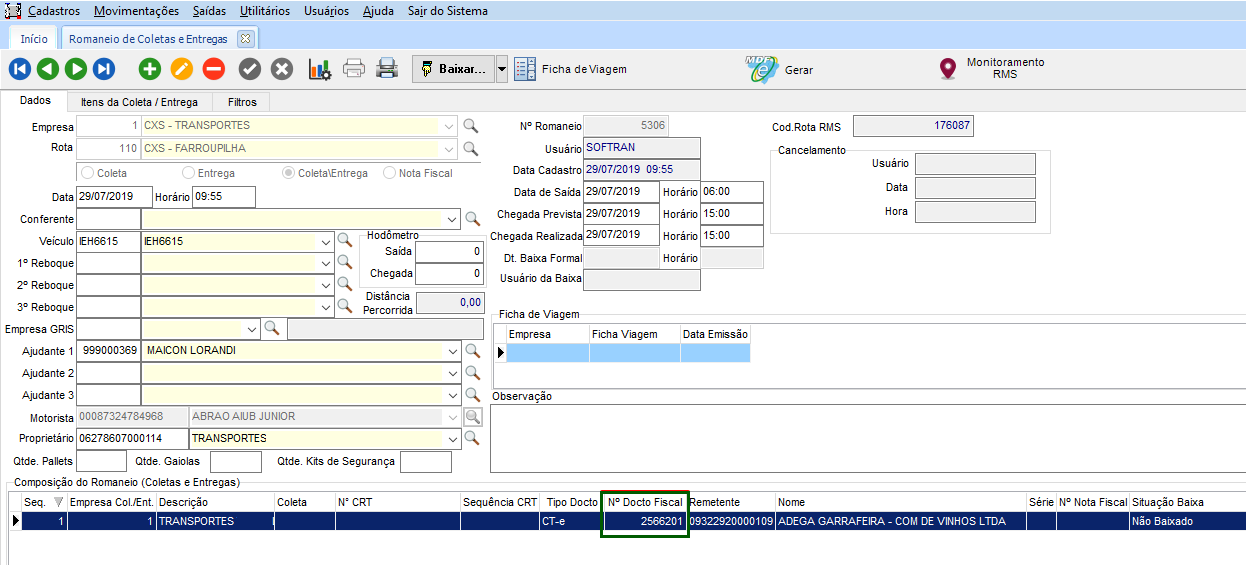 No RMS, em Gestão Logística > Otimização Logística > Roteirização e Monitoramento > Atividades > Entregas, coletas e serviços. Consultar o registro que foi integrado, apresente corretamente os dados com o número do conhecimento.