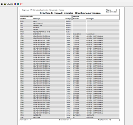 O relatório RVRA057.GER - Integração de Produtos para Receituário apresentará a relação dos produtos recebidos na integração e seu relacionamento com o cadastro de produto/derivação do ERP Senior, possibilitando a conferência e verificação da situação dos itens. O relatório poderá ser aberto por meio d a tela F113CPI, por meio do botão Relatório.