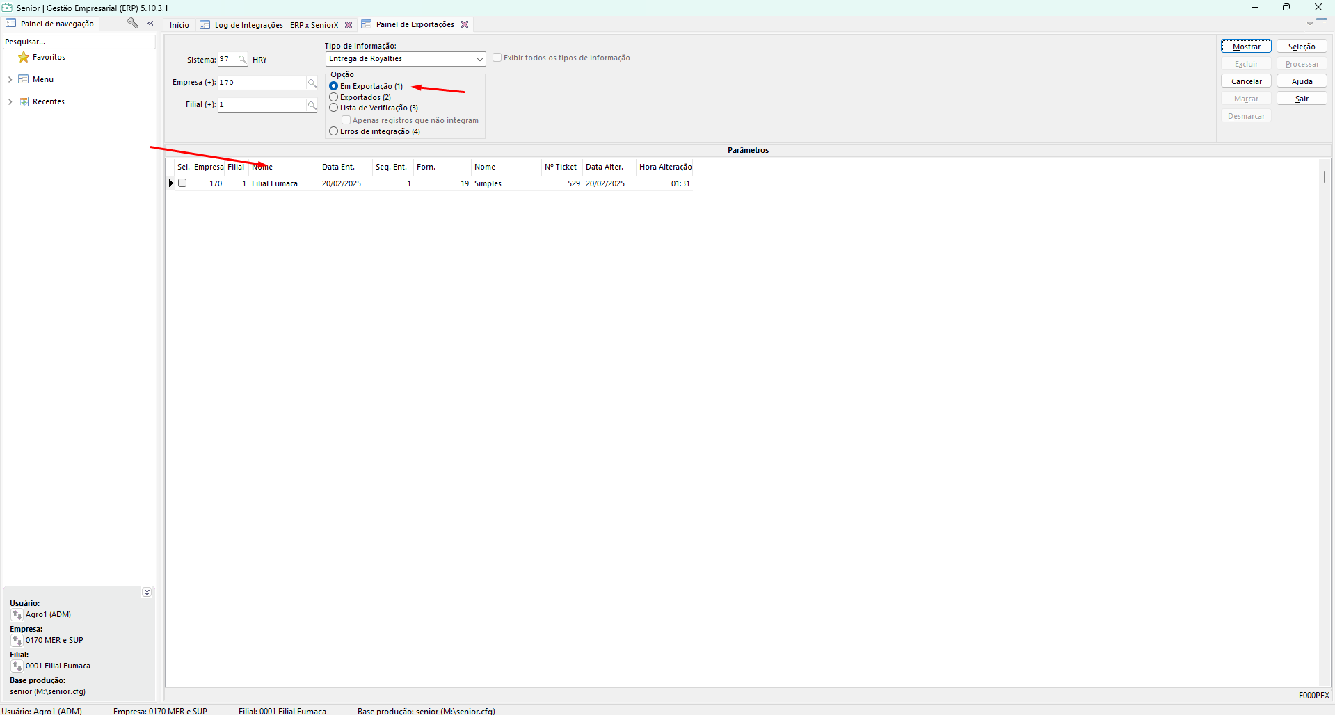 É feito o acesso a tela F000PEX, a partir do caminho Cadastros > Integrações (1) > Painel de exportações e, pode-ser observar um registro de Entrega de Royalties na fila de Integração.