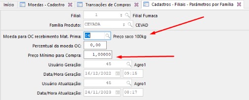 Caso a valorização seja realizada pela Nota Fiscal de compra, deve-se parametrizar a transação utilizada na geração da nota fiscal. Caso a valorização seja realizada pela Ordem de Compra, deve-se parametrizar a transação utilizada na movimentação pela tela de Compras - Controle de Entradas e Saídas (F35CCC). Nesse caso, a movimentação de estoque será gerada pelo valor da Ordem de Compra. Entretanto, deve-se lembrar que, o valor mínimo da OC segue as definições de preço do agronegócio, conforme a documentação de Definição de Preço e Moeda.