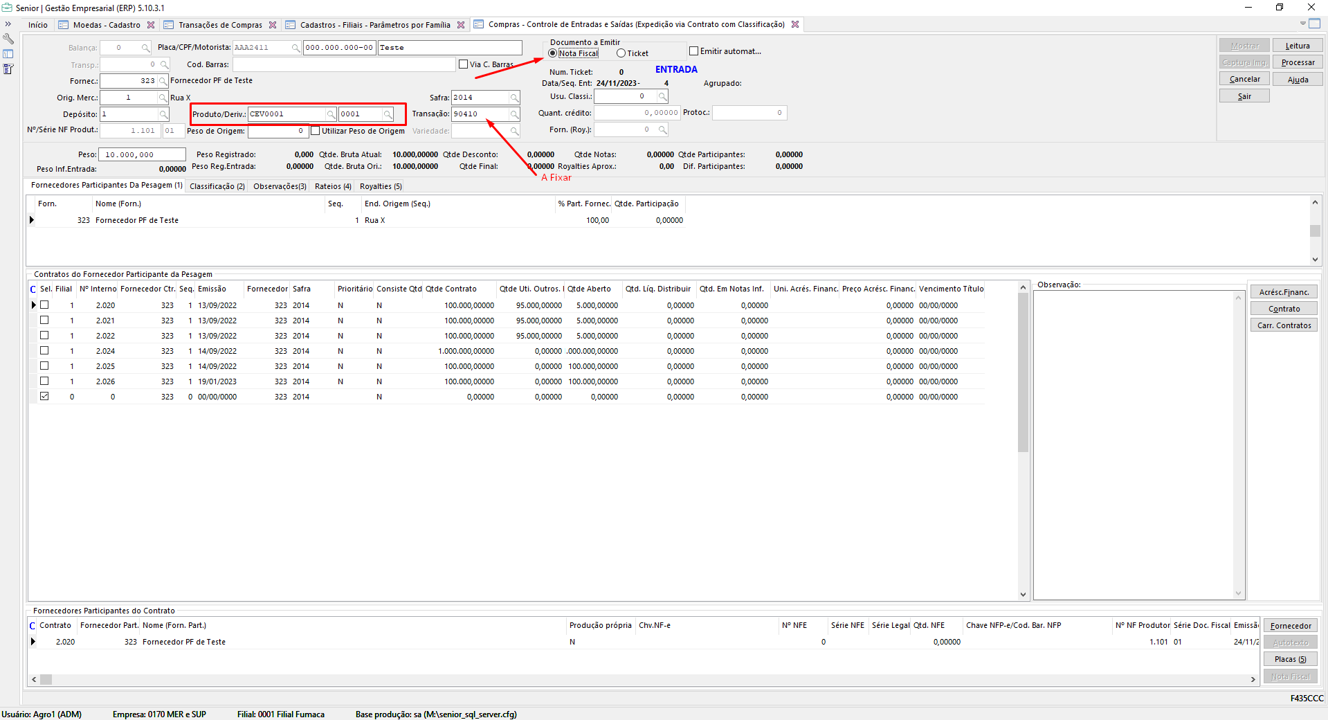 Ao realizar uma entrada de mercadoria com fornecedor Pessoa Física e tipo de recebimento como "A Fixar", é possível calcular os valores referentes ao Funrural, Senar e Gilrat durante a entrada, ou deixar para calcular no momento da fixação do preço. No segundo caso, caso o preço a fixar seja menor que o valor simbólico de entrada, é preciso gerar uma nota de devolução para acerto do valor do estoque, pois o produtor não é obrigado a emitir nota complementar. Entretanto, isso dificulta o cálculo dos impostos, já que o produtor não emitiu nenhum documento.