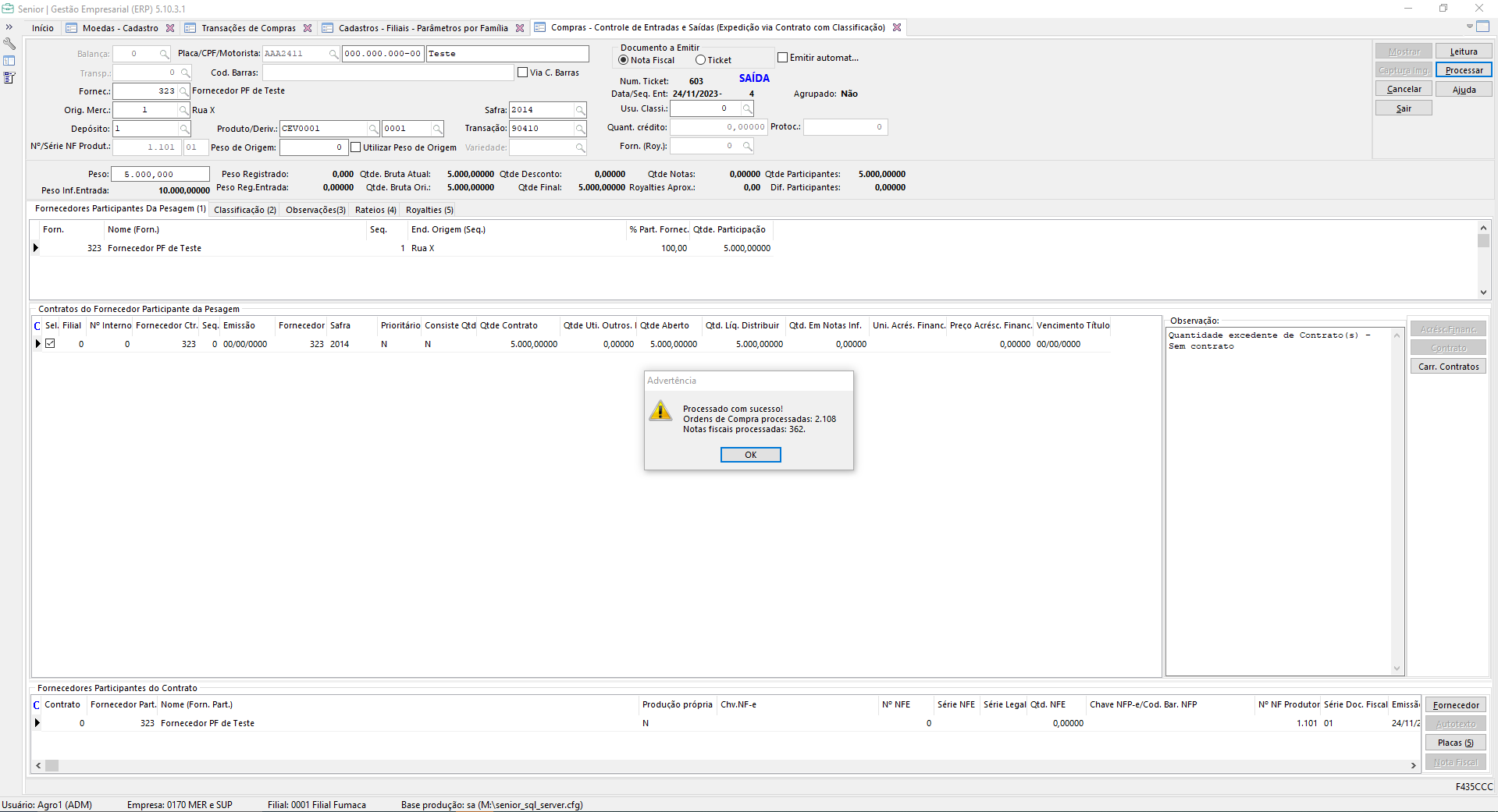 Caso as transações estejam configuradas corretamente, ao realizar a fixação pela tela de Fixação de Preços (F439FIX), a nota de acerto será gerada automaticamente (é necessário ter marcado a opção Gerar notas complementares). O sistema exibirá a mensagem "Notas de acerto (Funrural, Senar, Gilrat) processadas: XXX".