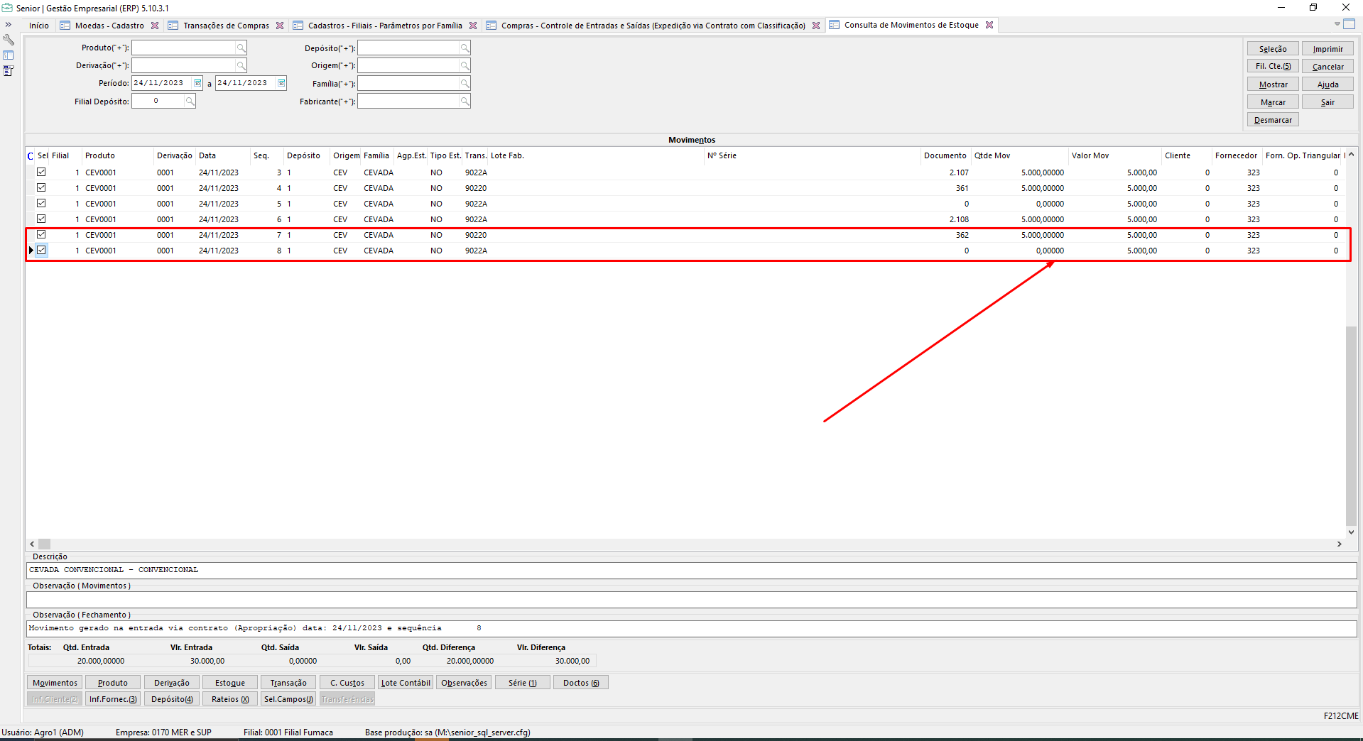 Agora, ao consultar a movimentação na tela de Consulta de Movimentos de Estoque (F212CME), vemos duas transações complementares no período: