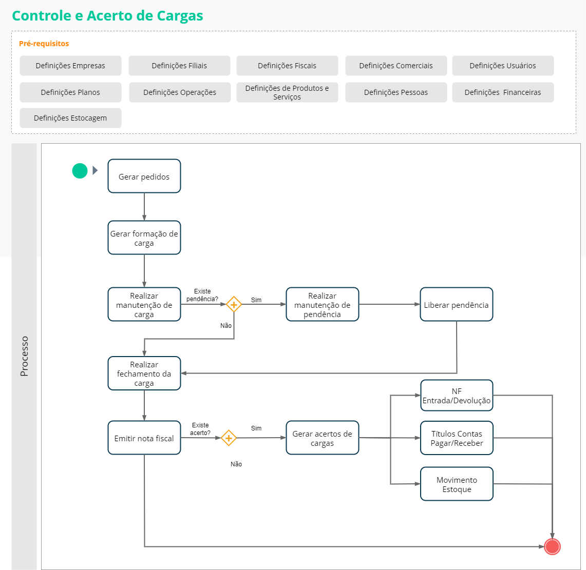 O processo de cargas e acertos visa atender as necessidades de empresas distribuidoras de mercadorias, as quais necessitam de controles e procedimentos para cargas, baseadas em rotas de entrega e capacidade da frota, controle de veículos e motoristas, como também acertos financeiros gerados por esses processos.